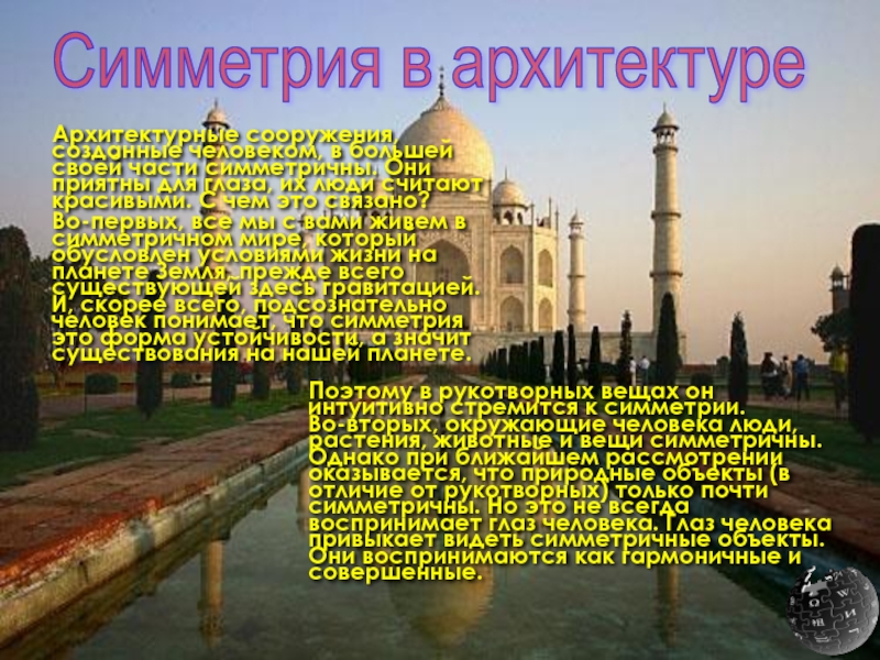 Слайд 34 Архитектурные сооружения, созданные человеком, в большей своей части симметричны. Они приятны