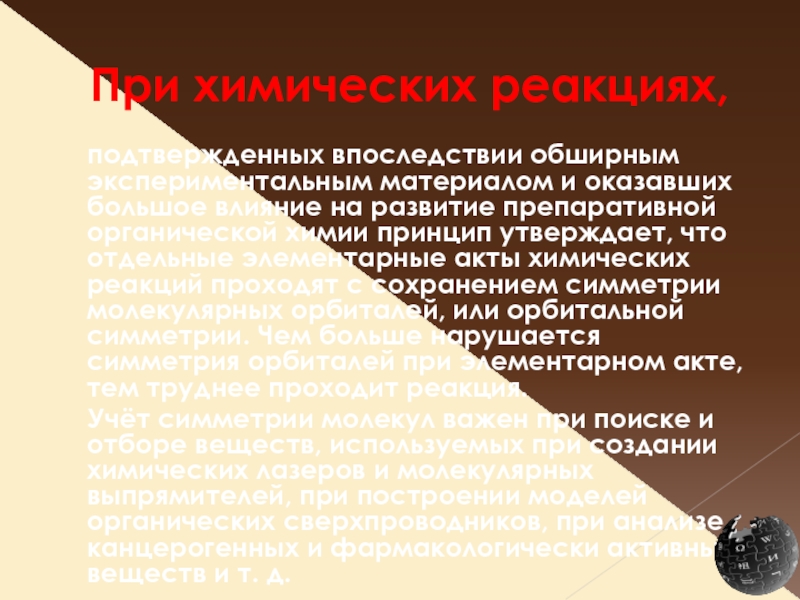 на развитие препаративной органической химии принцип утверждает, что отдельные элементарные акты химических реакций проходят с сохранением симметрии молекулярных орбиталей, или орбитальной симметрии. Чем больше нарушается симметрия орбиталей при элементарном акте, тем труднее проходит реакция.