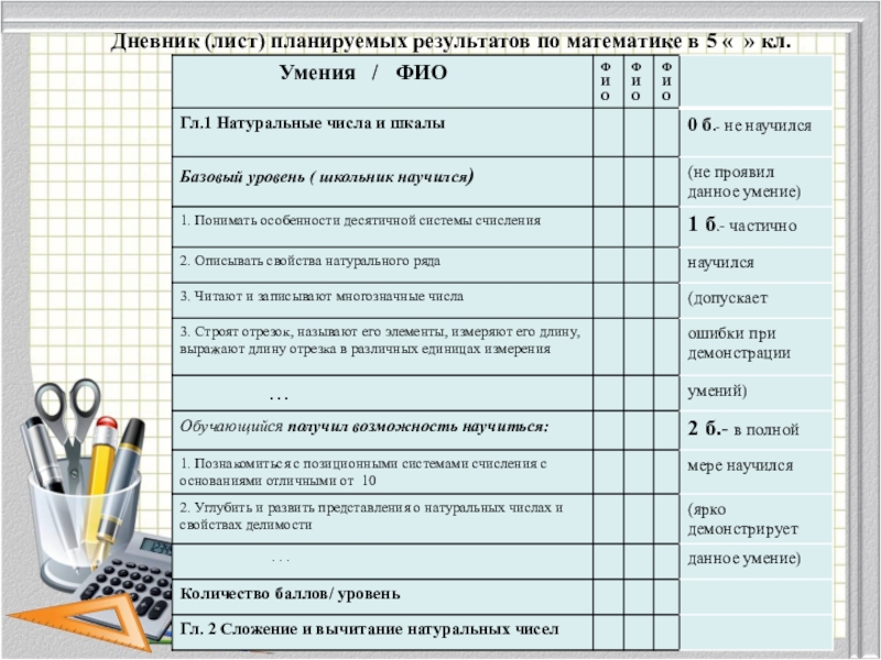 Слайд 6Дневник (лист) планируемых результатов по математике в 5 « » кл. easyen.ru/load/math/5_klass/