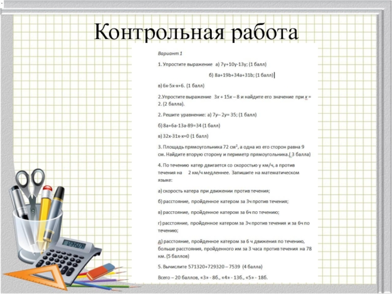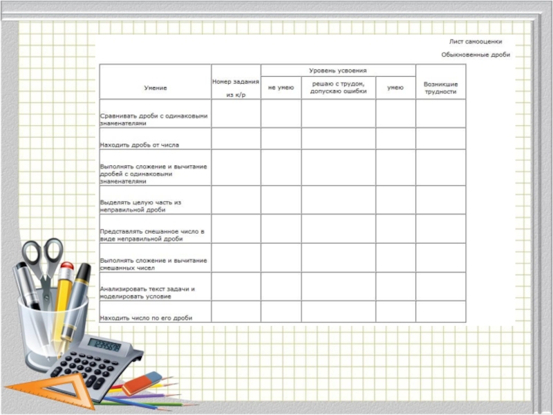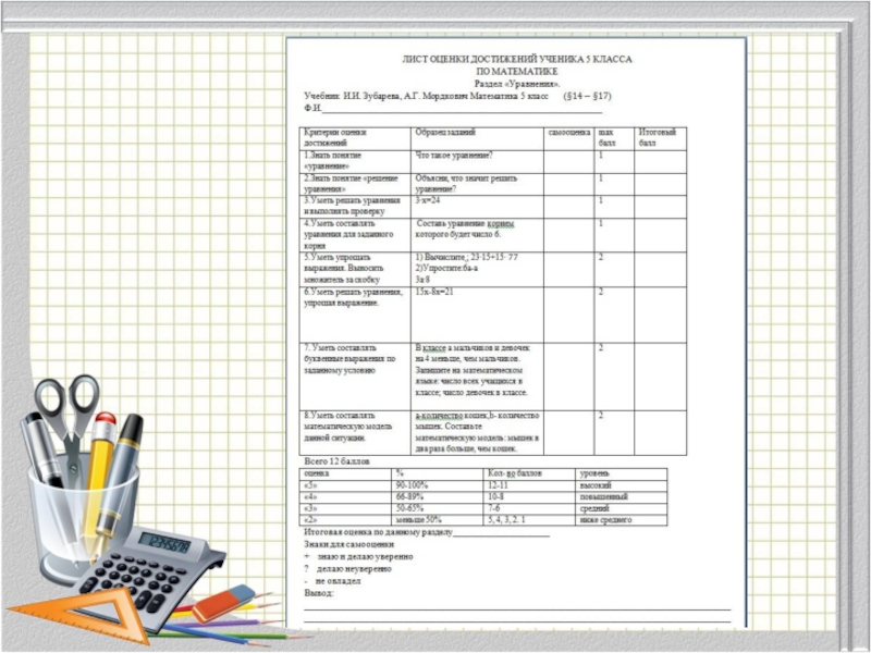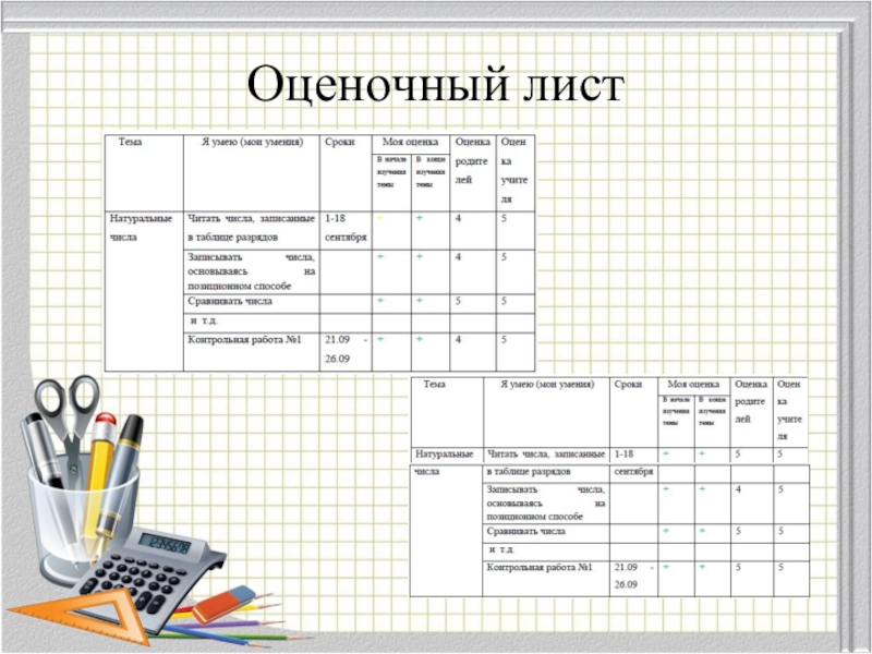 Слайд 7 Оценочный лист по математике ученика(цы) 5 « » класса