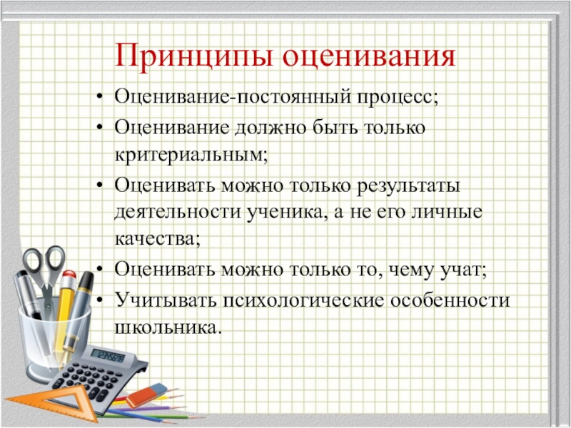 Принципы оцениванияОценивание-постоянный процесс;Оценивание должно быть только критериальным;Оценивать можно только результаты деятельности ученика, а не его личные качества;Оценивать