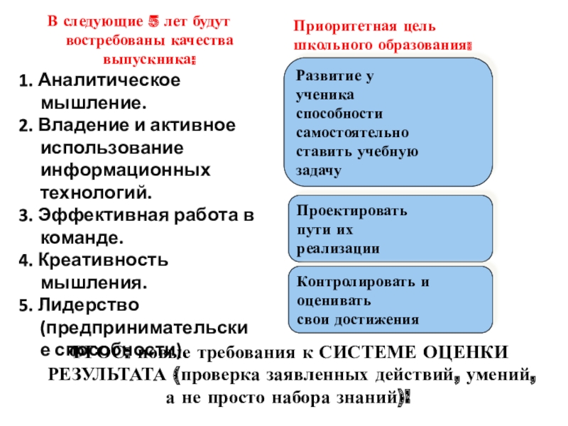 ФГОС: новые требования к СИСТЕМЕ ОЦЕНКИ РЕЗУЛЬТАТА (проверка заявленных действий, умений, а не просто набора знаний)!