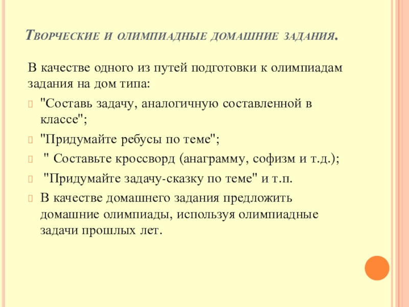 В качестве домашнего задания предложить домашние олимпиады, используя олимпиадные задачи прошлых лет.