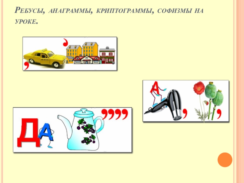 Слайд 9Ребусы, анаграммы, криптограммы, софизмы на уроке.