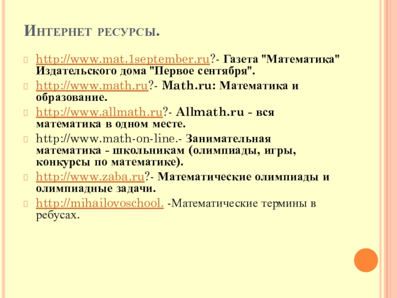 http://www.mat.1september.ru?- Газета "Математика" Издательского дома "Первое сентября".
