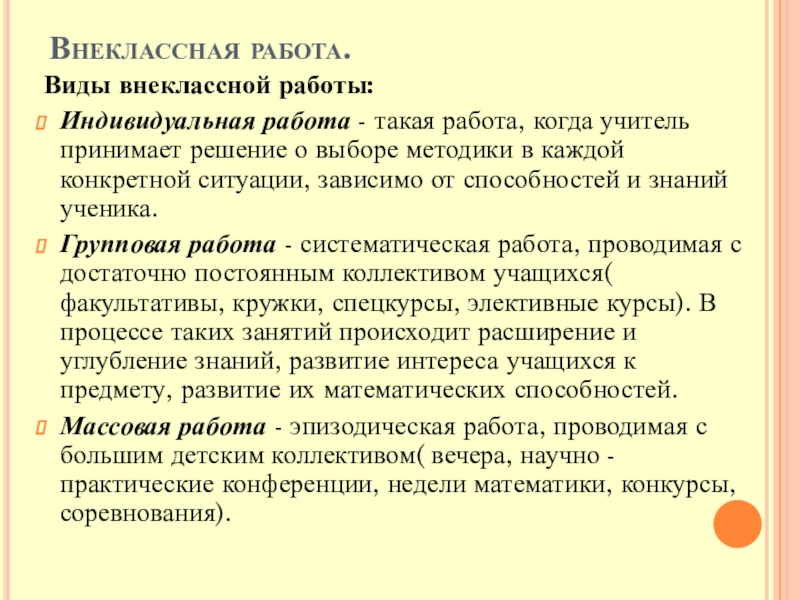 Массовая работа - эпизодическая работа, проводимая с большим детским коллективом( вечера, научно - практические конференции, недели математики, конкурсы, соревнования).