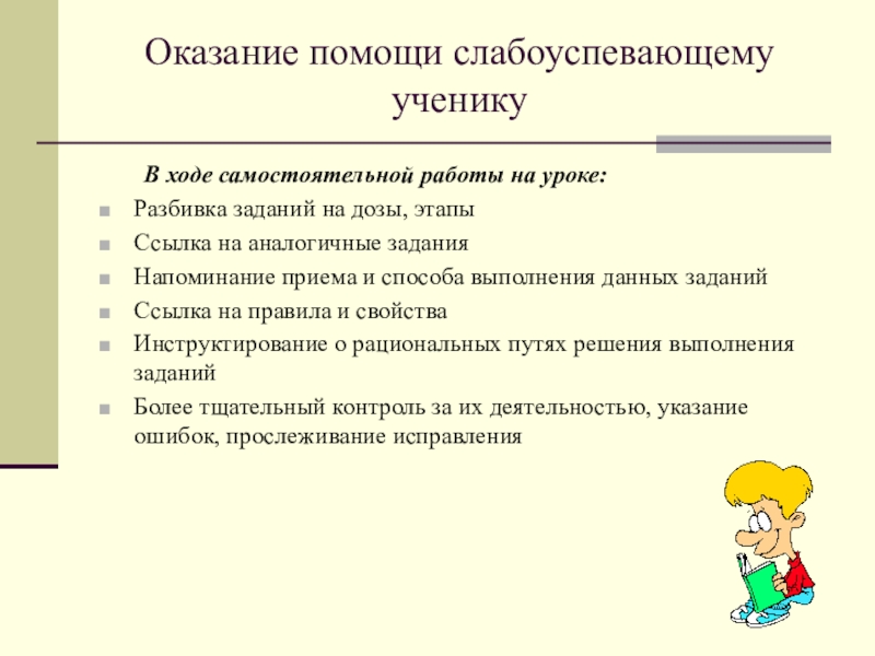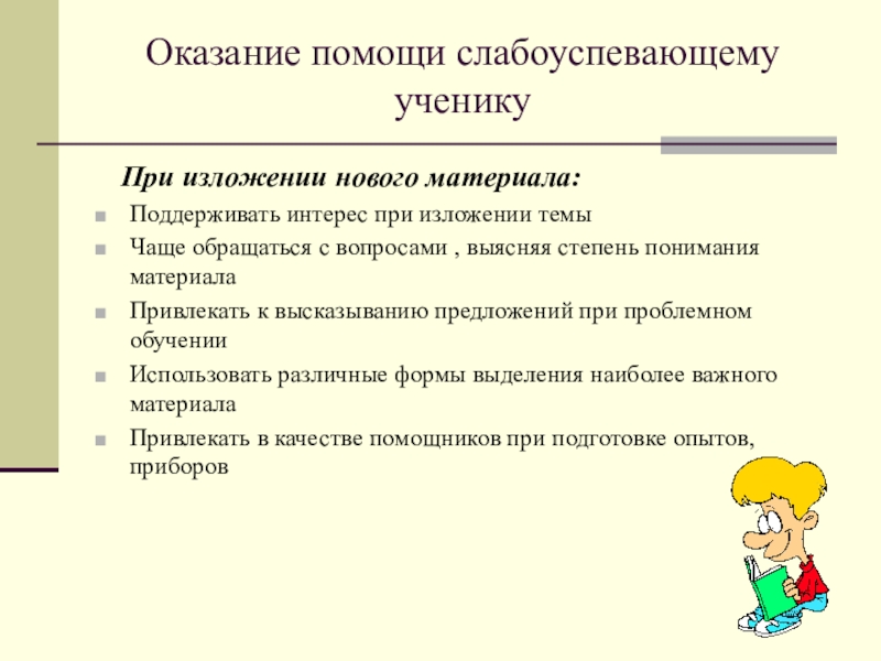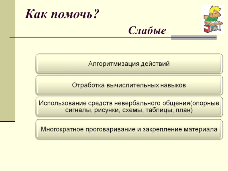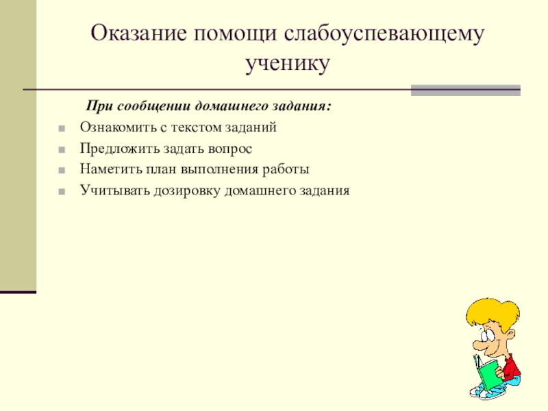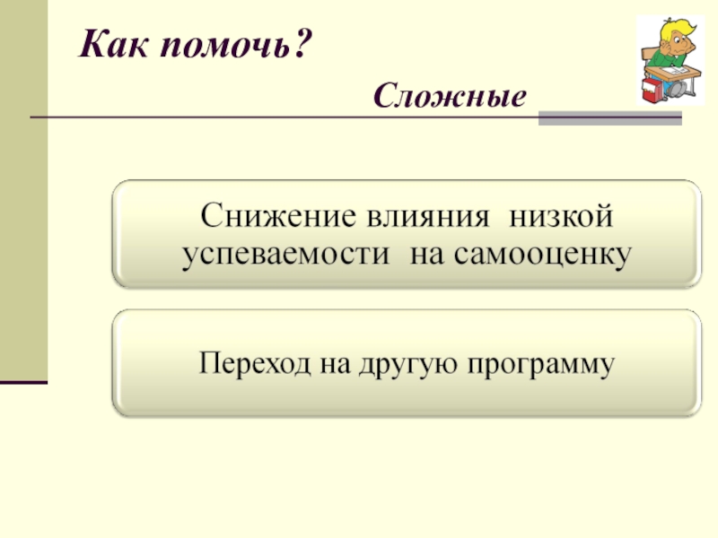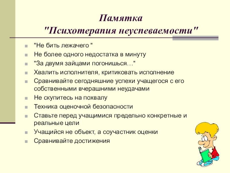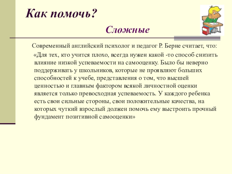 «Для тех, кто учится плохо, всегда нужен какой -то способ снизить влияние низкой успеваемости на самооценку. Было бы неверно поддерживать у школьников, которые не проявляют больших способностей к учебе, представления о том, что высшей ценностью и главным фактором всякой личностной оценки является только превосходная успеваемость. У каждого ребенка есть свои сильные стороны, свои положительные качества, на которых чуткий взрослый должен помочь ему выстроить прочный фундамент позитивной самооценки»