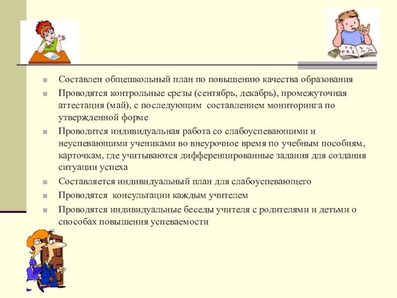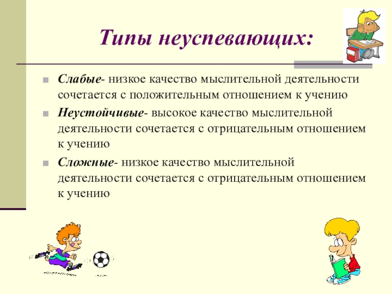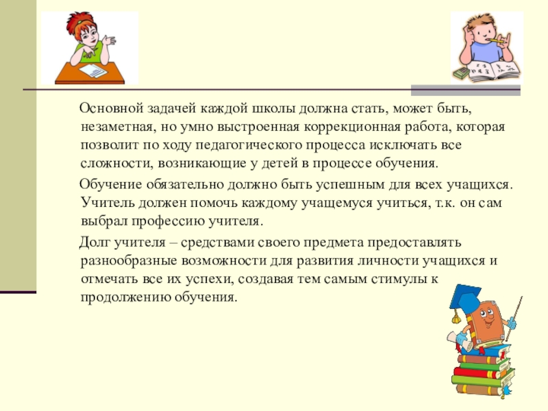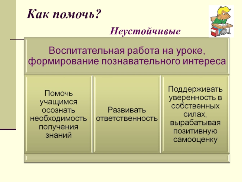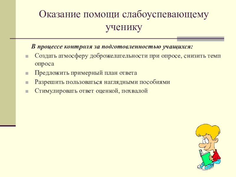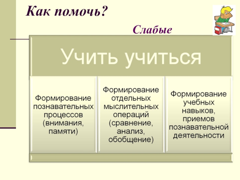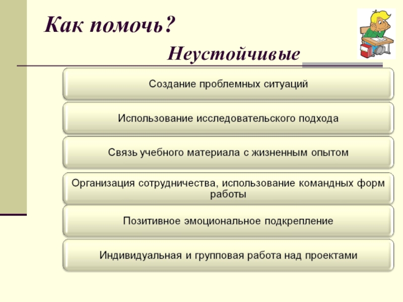«Для тех, кто учится плохо, всегда нужен какой -то способ снизить влияние низкой успеваемости на самооценку. Было бы неверно поддерживать у школьников, которые не проявляют больших способностей к учебе, представления о том, что высшей ценностью и главным фактором всякой личностной оценки является только превосходная успеваемость. У каждого ребенка есть свои сильные стороны, свои положительные качества, на которых чуткий взрослый должен помочь ему выстроить прочный фундамент позитивной самооценки»
