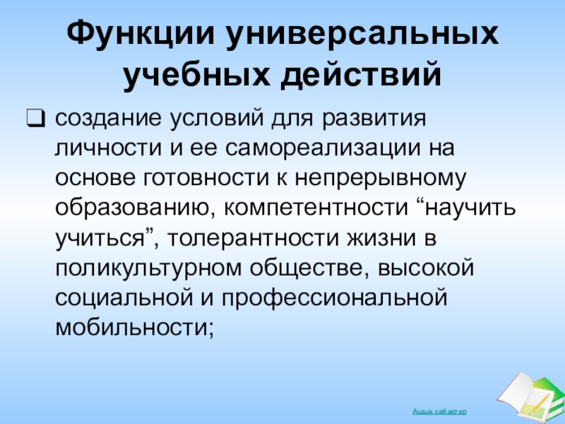 В более узком (собственно психологическом значении) термин “универсальные учебные действия” можно определить как совокупность действий учащегося, обеспечивающих его культурную идентичность, социальную компетентность, толерантность, способность к самостоятельному усвоению новых знаний и умений, включая организацию этого процесса.