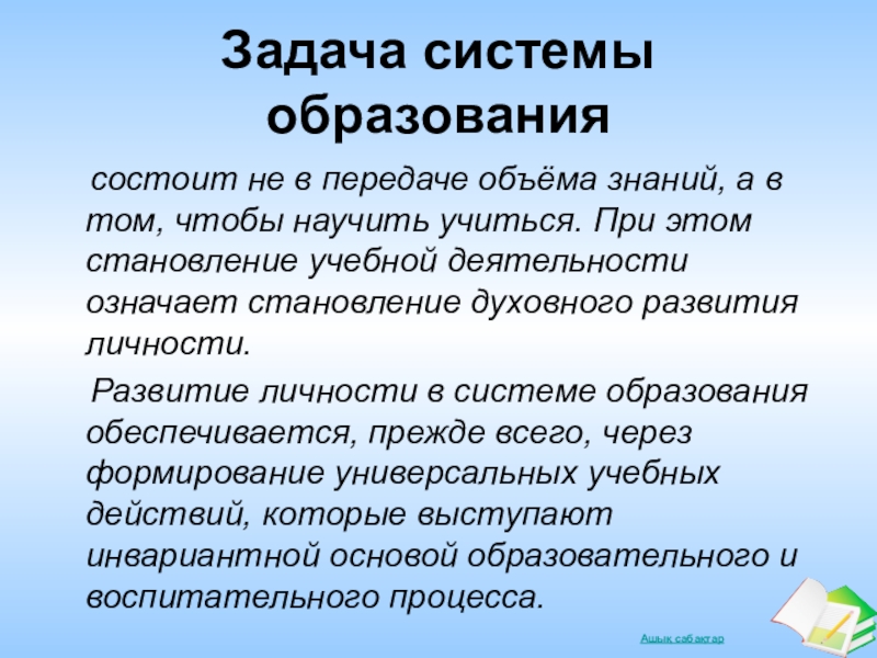 в том, чтобы научить учиться. При этом становление учебной деятельности означает становление духовного развития личности.