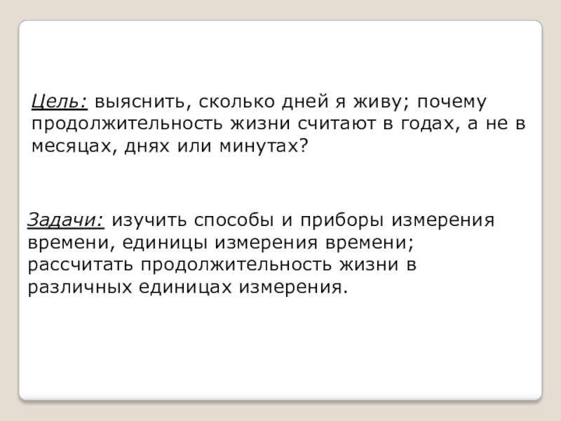 Задачи: изучить способы и приборы измерения времени, единицы измерения времени; рассчитать продолжительность жизни в различных единицах измерения.