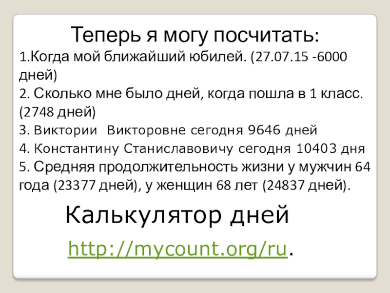 Что бы посчитать, сколько дней мне сегодня нужно прибавить 7 дней февраля и 21 день марта.
