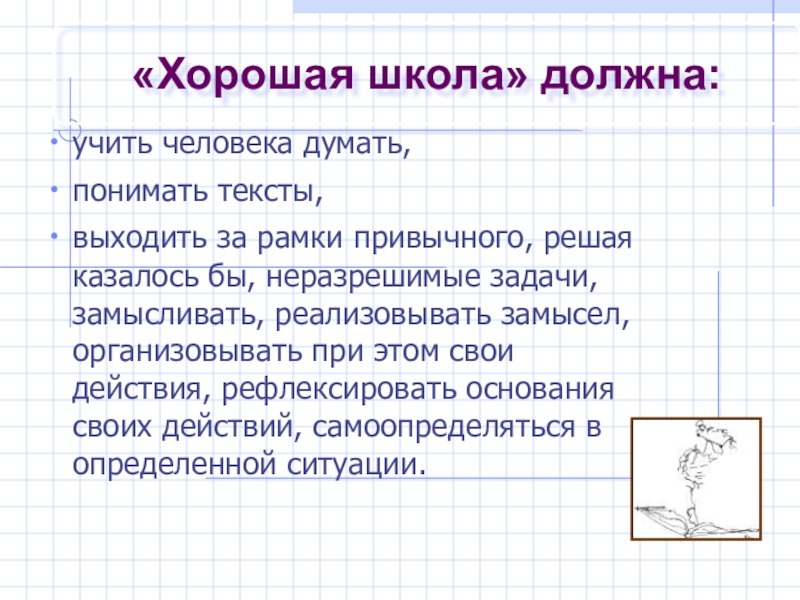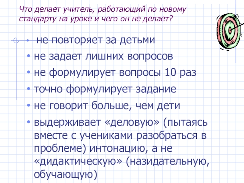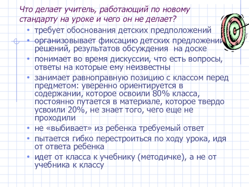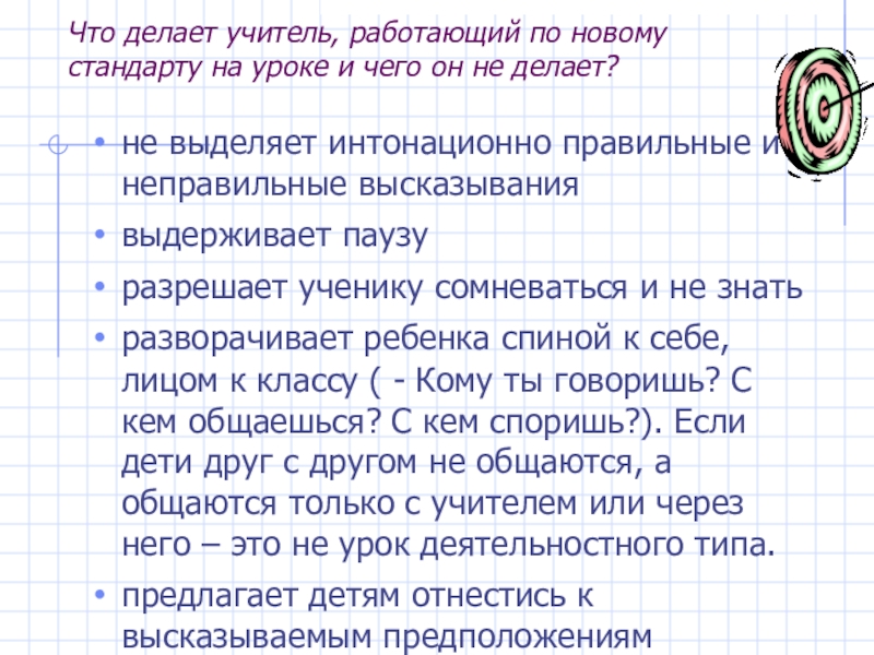 разворачивает ребенка спиной к себе, лицом к классу ( - Кому ты говоришь? С кем общаешься? С кем споришь?). Если дети друг с другом не общаются, а общаются только с учителем или через него – это не урок деятельностного типа.