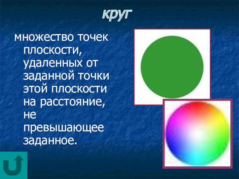 Имеет центр (centre), диаметр (diameter), радиус (radius)