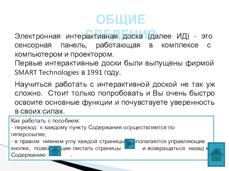 Электронная интерактивная доска (далее ИД) - это сенсорная панель, работающая в комплексе с компьютером и проектором.