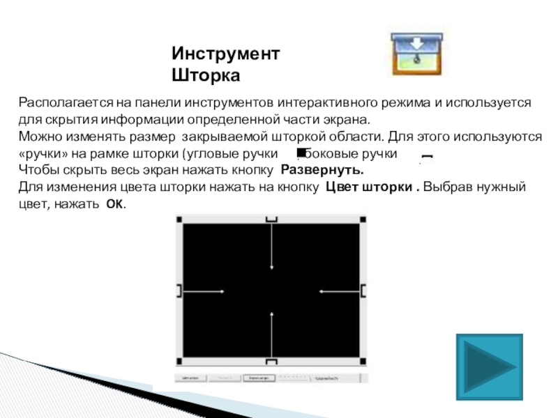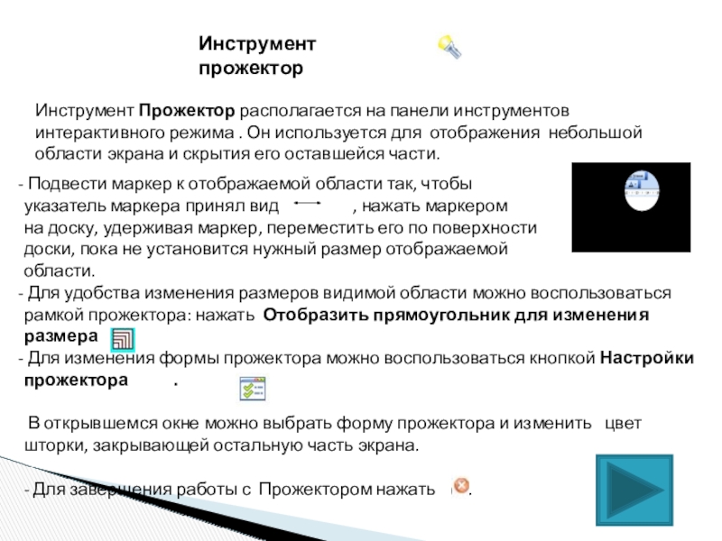 Инструмент Прожектор располагается на панели инструментов интерактивного режима . Он используется для отображения небольшой области экрана и скрытия его оставшейся части.
