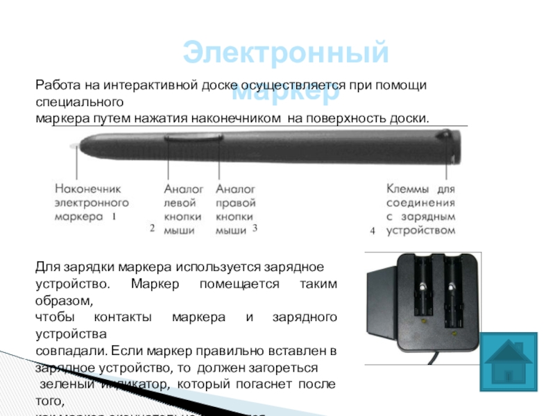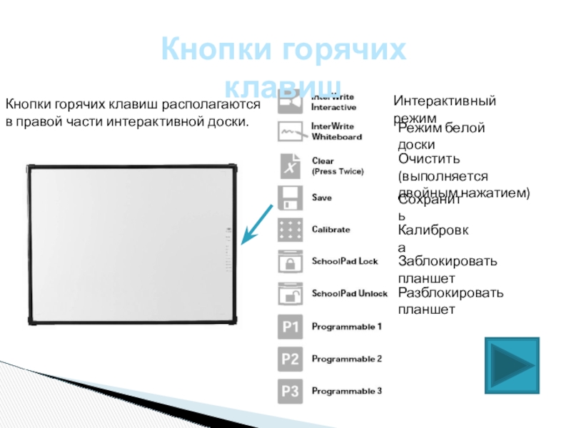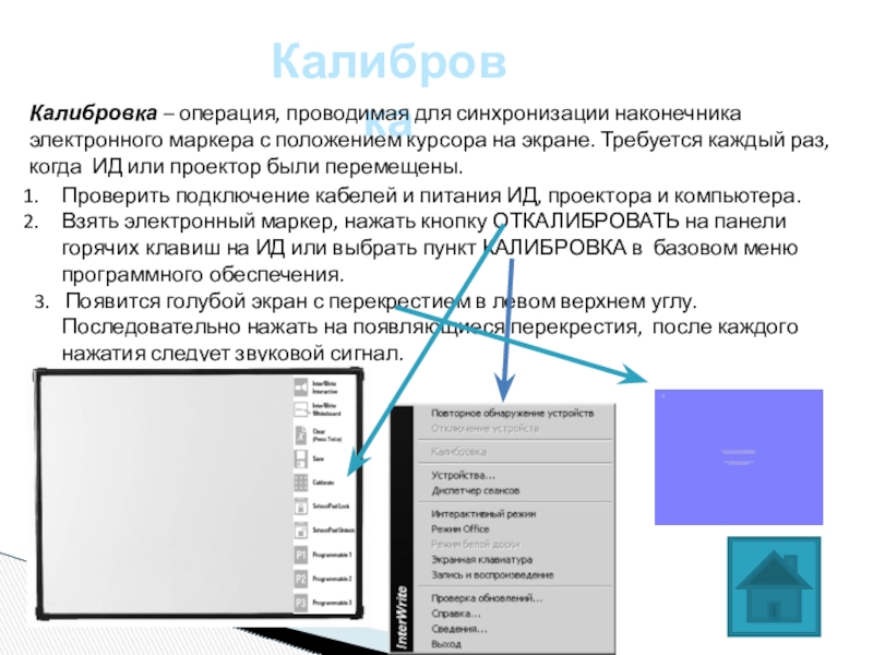Калибровка – операция, проводимая для синхронизации наконечника электронного маркера с положением курсора на экране. Требуется каждый раз, когда ИД или проектор были перемещены.