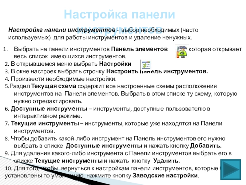 9. Для удаления какого-либо инструмента с Панели инструментов выбрать его в списке Текущие инструменты и нажать кнопку Удалить.