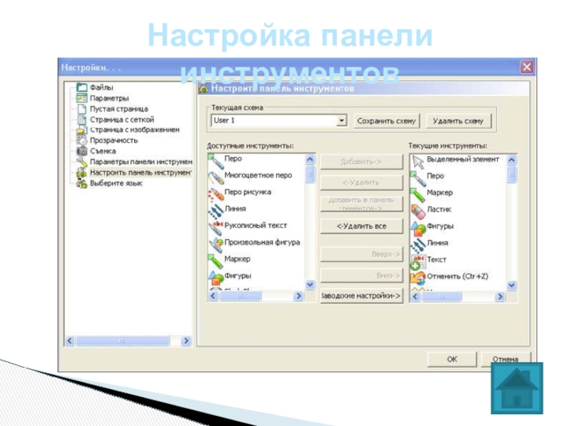 5.Раздел Текущая схема содержит все настроенные схемы расположения инструментов на Панели элементов. Выбрать в этом списке ту схему, которую нужно отредактировать.