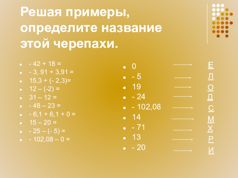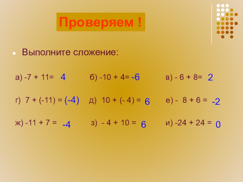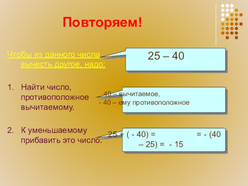 25 + ( - 40) = = - (40 – 25) = - 15