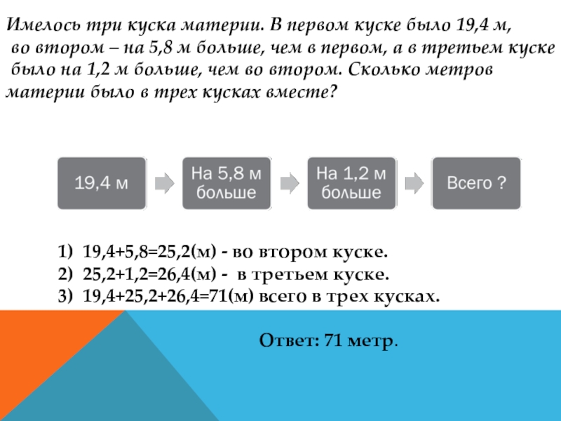 3) 19,4+25,2+26,4=71(м) всего в трех кусках.