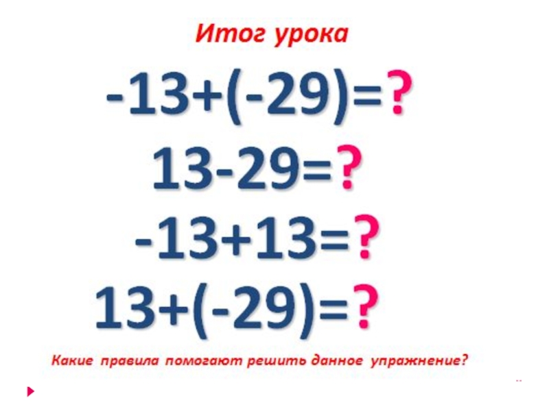 Цель:Закрепить навыки в умении складывать и вычитать положительные и отрицательные числа; закрепить понимание правил сложения и вычитания