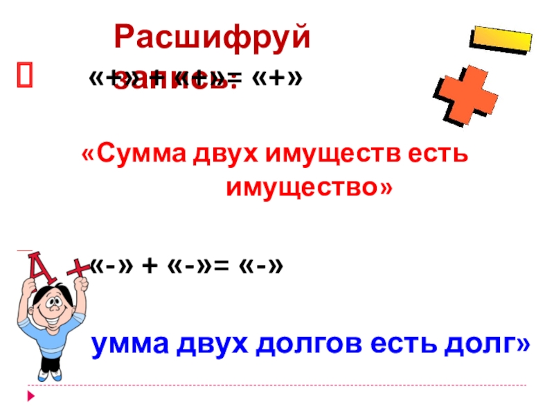 Расшифруй запись:«+» + «+»= «+»«Сумма двух имуществ есть имущество» «-» + «-»= «-»«Сумма двух долгов есть долг»