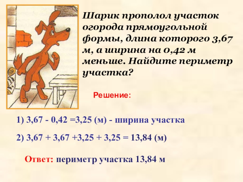 Шарик прополол участок огорода прямоугольной формы, длина которого 3,67м, а ширина на 0,42 м меньше. Найдите периметр участка?