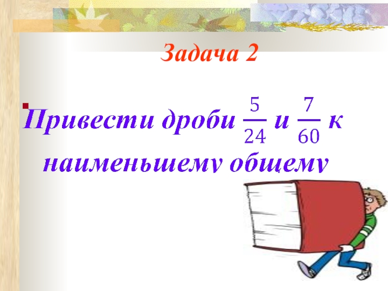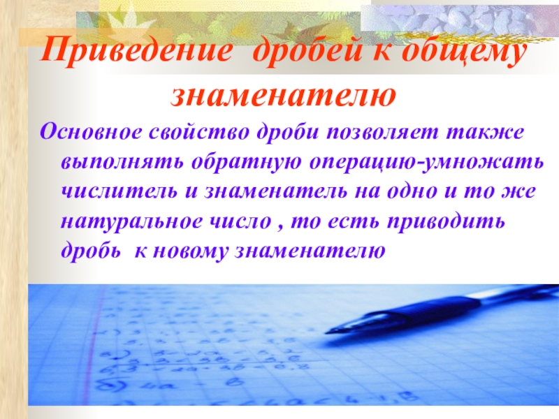 Приведение дробей к общему знаменателю Основное свойство дроби позволяет также выполнять обратную операцию-умножать числитель и знаменатель на