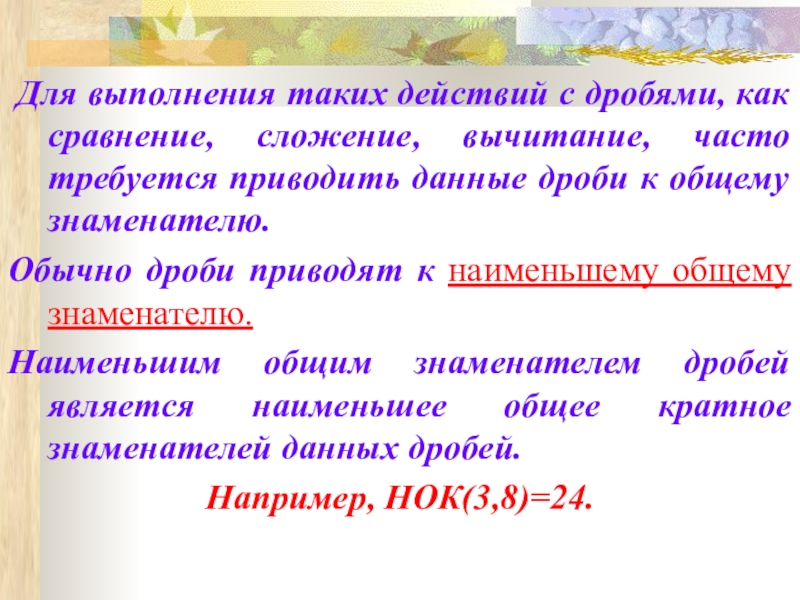 Для выполнения таких действий с дробями, как сравнение, сложение, вычитание, часто требуется приводить данные дроби к