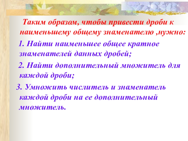Таким образом, чтобы привести дроби к наименьшему общему знаменателю ,нужно:  1. Найти наименьшее общее кратное знаменателей