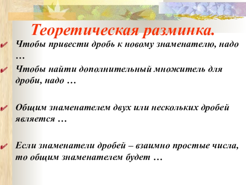 Теоретическая разминка.Чтобы привести дробь к новому знаменателю, надо …Чтобы найти дополнительный множитель для дроби, надо …Общим знаменателем двух или нескольких дробей является …Если знаменатели дробей – взаимно простые числа, то общим знаменателем будет …