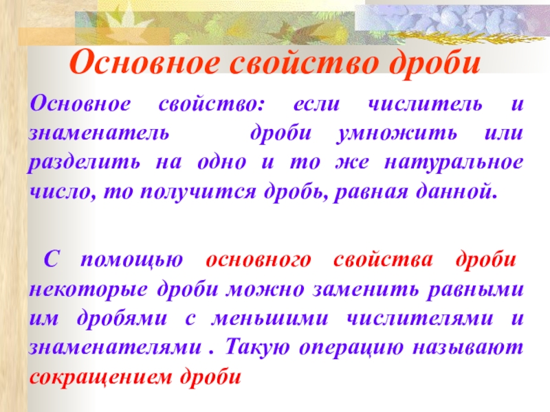 Основное свойство дроби  Основное свойство: если числитель и знаменатель  дроби умножить или разделить на
