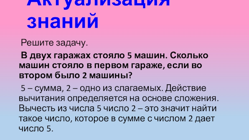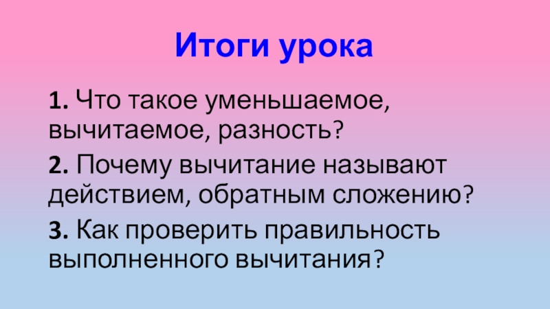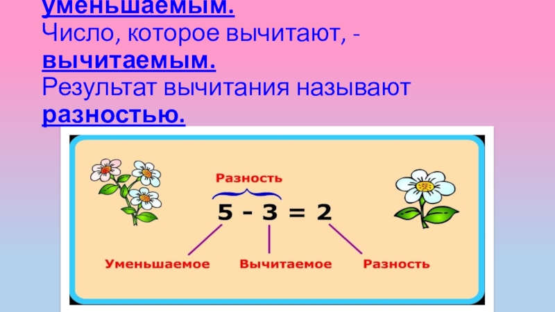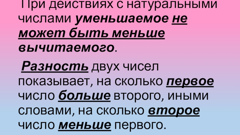 Разность двух чисел показывает, на сколько первое число больше второго, иными словами, на сколько второе число меньше первого.