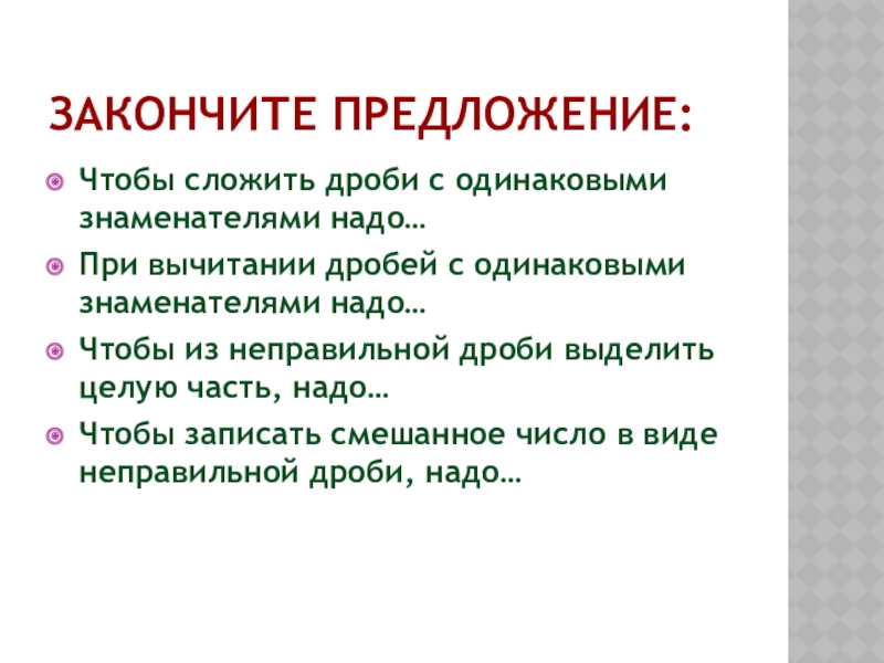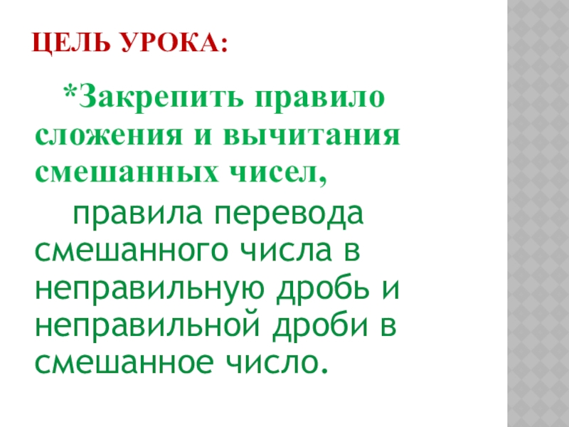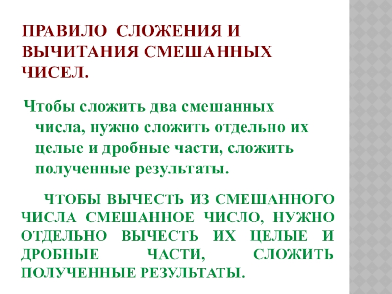 ЧТОБЫ ВЫЧЕСТЬ ИЗ СМЕШАННОГО ЧИСЛА СМЕШАННОЕ ЧИСЛО, НУЖНО ОТДЕЛЬНО ВЫЧЕСТЬ ИХ ЦЕЛЫЕ И ДРОБНЫЕ ЧАСТИ, СЛОЖИТЬ ПОЛУЧЕННЫЕ РЕЗУЛЬТАТЫ.