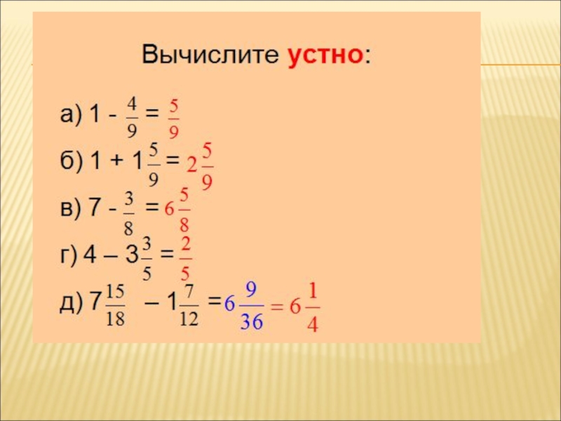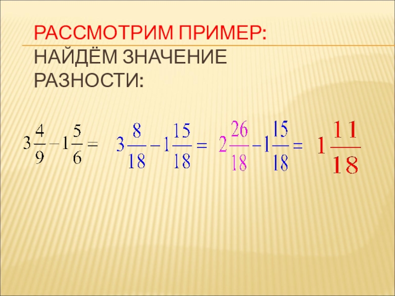 вычитание целых и дробных частей. Если дробная часть уменьшаемого меньше дробной части вычитаемого,уменьшить на единицу целую часть уменьшаемого и записать дробную часть в виде неправильной дроби