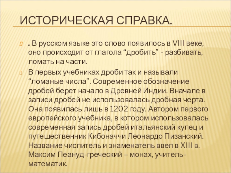 В первых учебниках дроби так и называли “ломаные числа”. Современное обозначение дробей берет начало в Древней Индии. Вначале в записи дробей не использовалась дробная черта. Она появилась лишь в 1202 году. Автором первого европейского учебника, в котором использовалась современная запись дробей итальянский купец и путешественник Кибоначчи Леонардо Пизанский. Название числитель и знаменатель ввел в XIII в. Максим Пеануд-греческий – монах, учитель-математик.