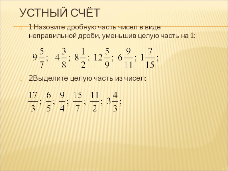 1 Назовите дробную часть чисел в виде неправильной дроби, уменьшив