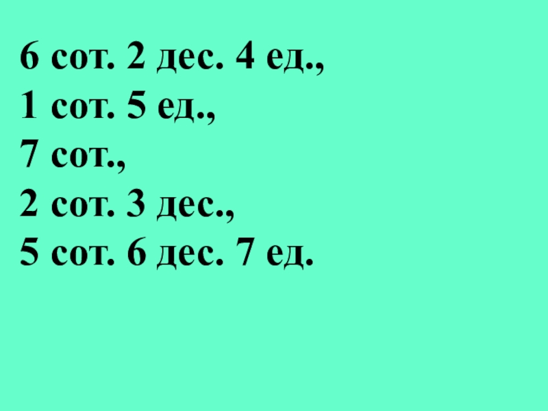6 сот. 2 дес. 4 ед., 1 сот. 5 ед., 7 сот., 2 сот. 3 дес., 5