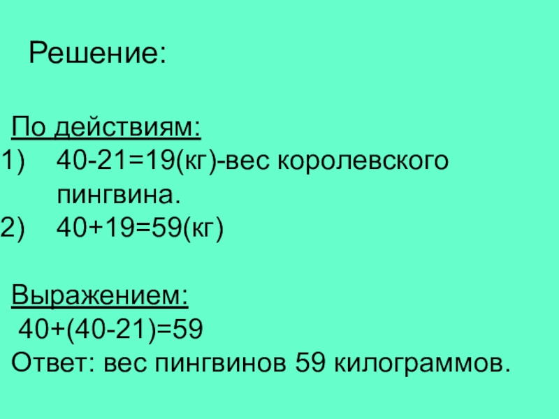 Решение:По действиям:40-21=19(кг)-вес королевского пингвина.40+19=59(кг)Выражением: 40+(40-21)=59Ответ: вес пингвинов 59 килограммов.