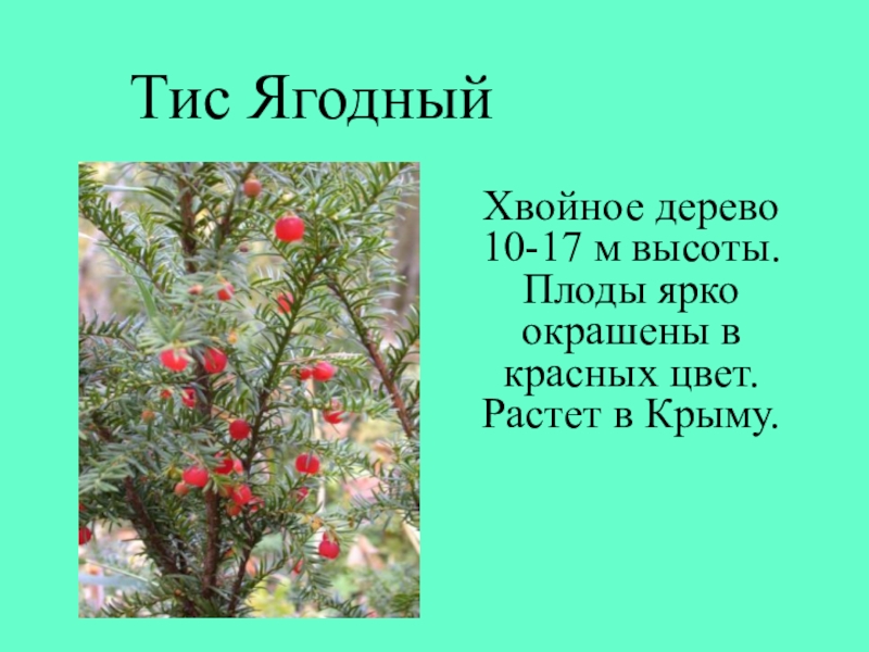 Тис Ягодный Хвойное дерево 10-17 м высоты. Плоды ярко окрашены в красных цвет. Растет в Крыму.