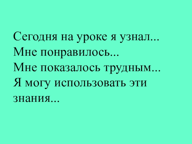Сегодня на уроке я узнал... Мне понравилось... Мне показалось трудным... Я могу использовать эти знания...