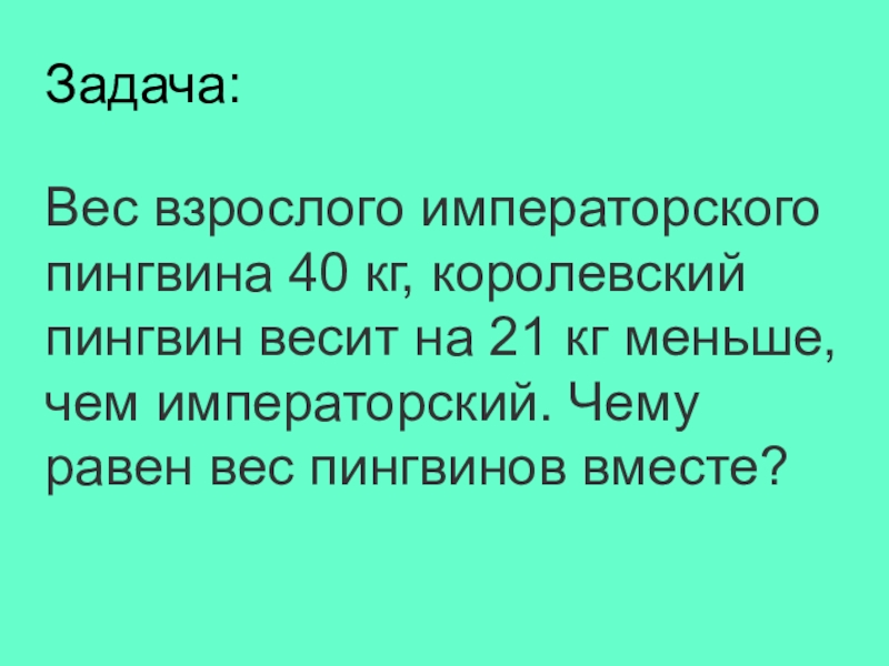 Задача:Вес взрослого императорского пингвина 40 кг, королевский пингвин весит на 21 кг меньше, чем императорский. Чему равен