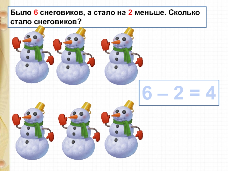 Было 6 снеговиков, а стало на 2 меньше. Сколько стало снеговиков?6 – 2 = 4