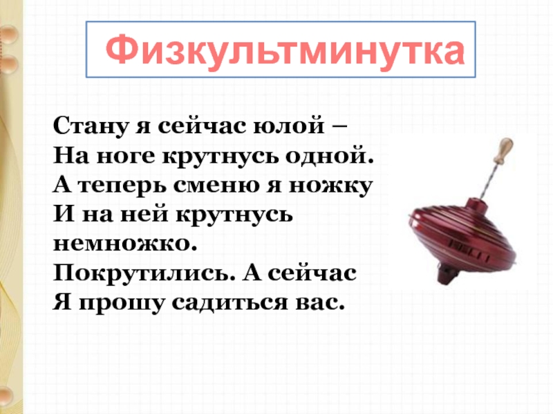 ФизкультминуткаСтану я сейчас юлой – На ноге крутнусь одной. А теперь сменю я ножку И на