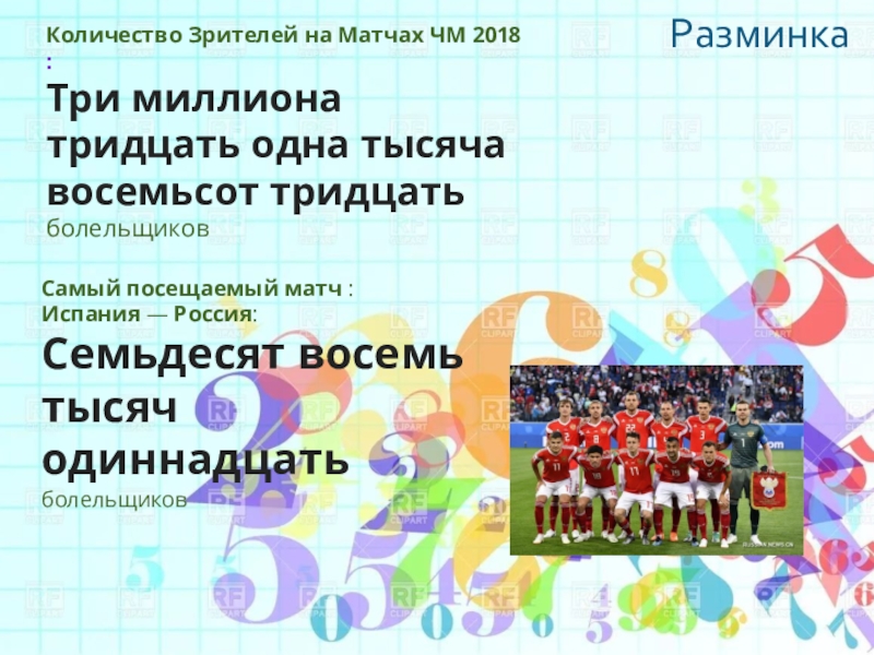 РазминкаСамый посещаемый матч : Испания — Россия: Семьдесят восемь тысяч одиннадцать болельщиков Количество Зрителей на Матчах ЧМ 2018 :Три миллиона тридцать одна тысяча