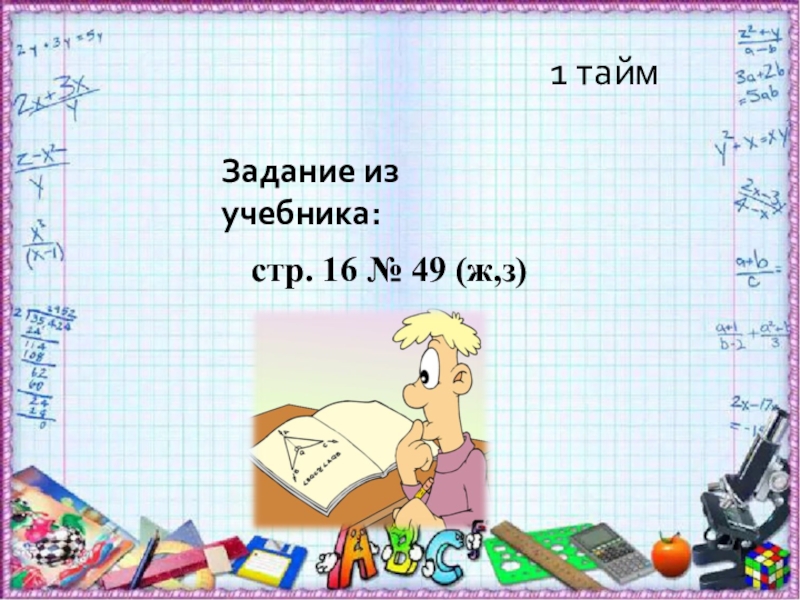 1 таймЗадание из учебника:  стр. 16 № 49 (ж,з)