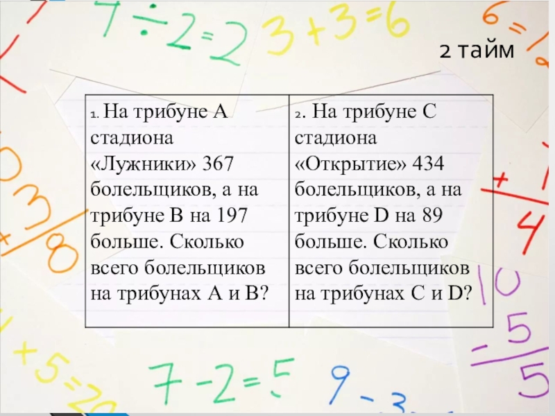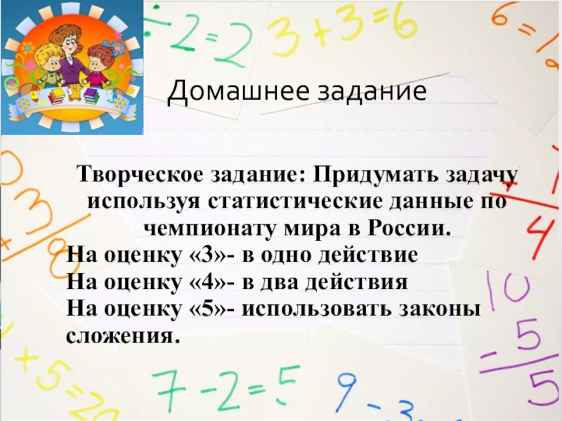 Домашнее заданиеТворческое задание: Придумать задачу используя статистические данные по чемпионату мира в России.На оценку «3»- в одно