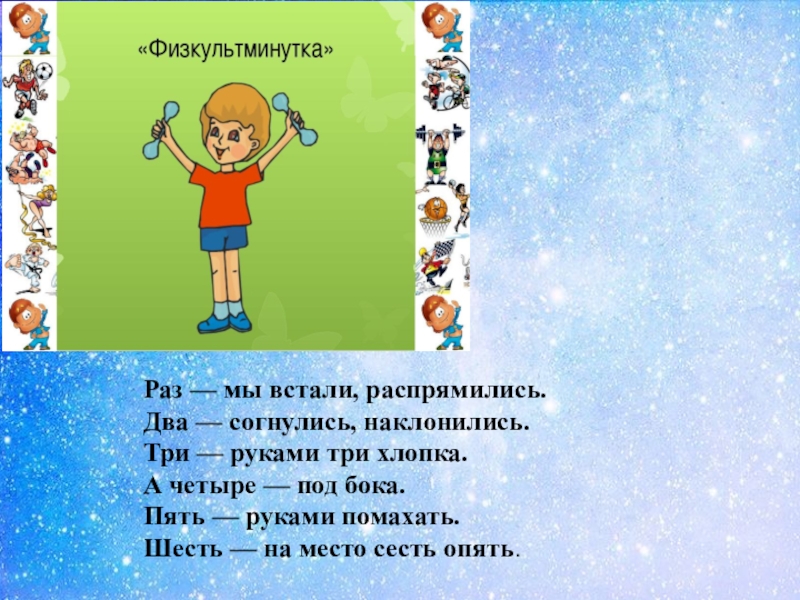 Раз — мы встали, распрямились.Два — согнулись, наклонились.Три — руками три хлопка.А четыре — под бока.Пять —