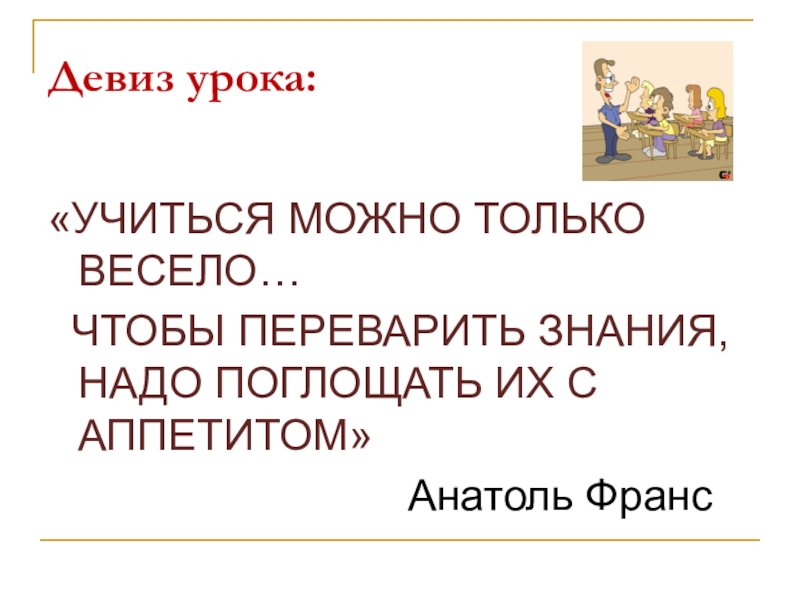 Девиз урока:«УЧИТЬСЯ МОЖНО ТОЛЬКО ВЕСЕЛО… ЧТОБЫ ПЕРЕВАРИТЬ ЗНАНИЯ, НАДО ПОГЛОЩАТЬ ИХ С АППЕТИТОМ»